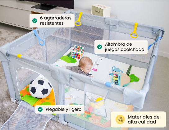 Tu bebé podrá jugar, gatear y ponerse de pie con total libertad y seguridad gracias a las 6 agarraderas, la alfombra acolchada y la estructura estable y protegida. Además, su diseño de malla transpirable te permite vigilar a tu pequeño en todo momento.